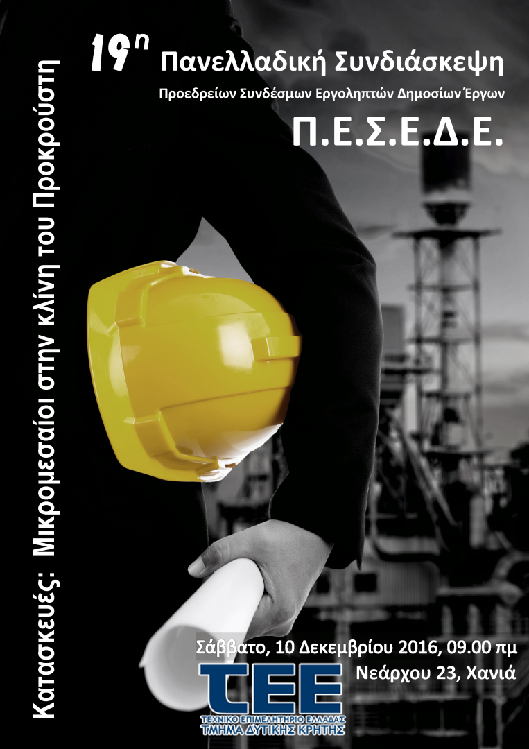 Το Σάββατο 10 Δεκεμβρίου 2016, στο Τ.Ε.Ε. Τμ. Δυτικής Κρήτης, στα Χανιά, πραγματοποιείται η 19η Πανελλήνια Συνδιάσκεψη των Προεδρείων της Π.Ε.Σ.Ε.∆.Ε. (Πανελλήνιας Ένωσης Συνδέσμων Εργοληπτών Δημοσίων Έργων)