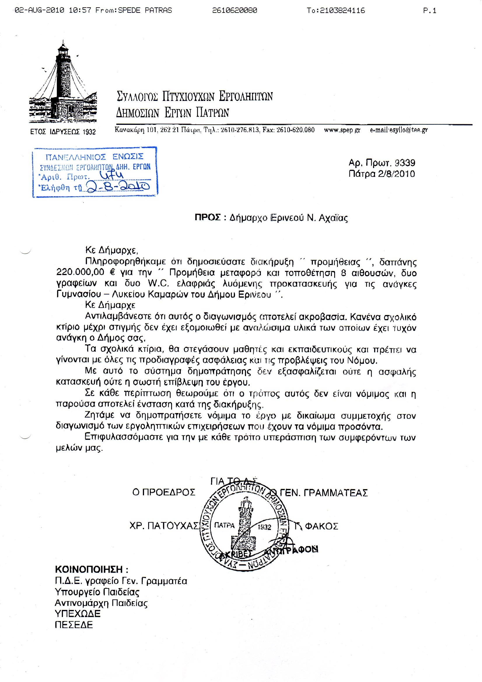 Κοινοποίηση επιστολής του Σ.Π.Ε.Δ.Ε. Πατρών προς τον Δήμαρχο Εριναιού Ν. Αχαϊας για την μη νόμιμη δημοσίευση διακήρυξης έργου