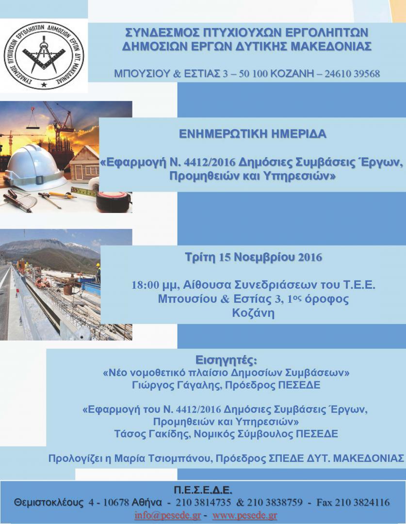 Ενημερωτική Ημερίδα του Σ.Π.Ε.Δ.Ε Δυτ. Μακεδονίας με θέμα : Εφαρμογή Ν. 4412/2016 Δημόσιες Συμβάσεις Έργων, Προμηθειών και Υπηρεσιών